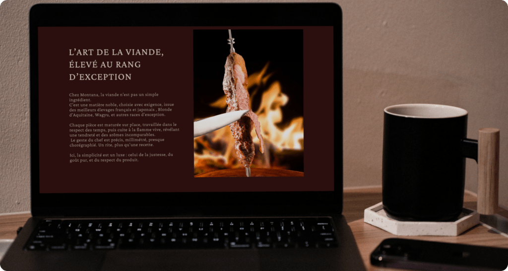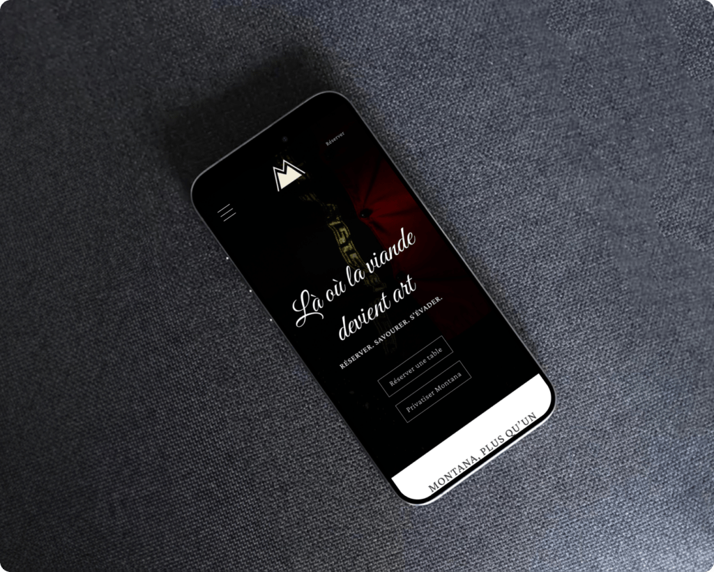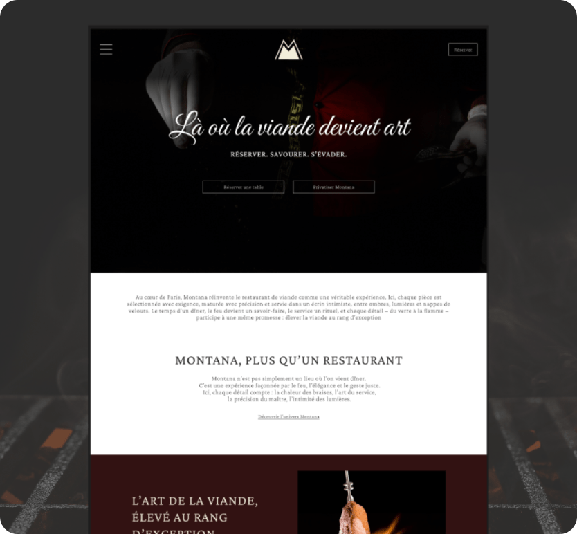 MONTANA est un concept de steakhouse haut de gamme pensé comme une véritable expérience immersive. Contrairement à un site e-commerce classique, l’objectif ici n’était pas de vendre un produit, mais de mettre en valeur un univers, une ambiance et des moments exclusifs. Le site a été conçu pour plonger l’utilisateur dans l’atmosphère du lieu, en valorisant des expériences uniques telles que la privatisation, les événements, les masterclass ou encore les soirées sur invitation. Chaque section a été pensée pour susciter l’envie, créer une projection et renforcer le sentiment d’exclusivité. Le parcours utilisateur est optimisé pour guider naturellement vers la réservation, transformant l’intérêt en passage à l’action.